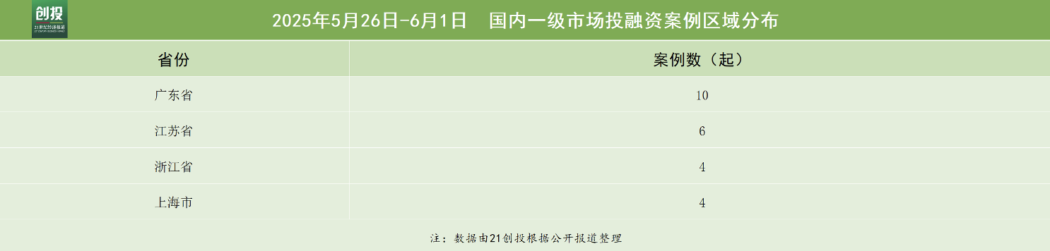 从披露获投企业的地域分布来看,本周的融资地区主要集中在广东省、江苏省、浙江省和上海市,分别有10笔、6笔、4笔、4笔融资。