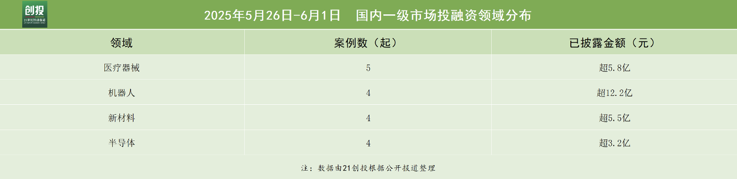 本周融资数量最多的行业领域仍是科技与制造。在三大行业领域的诸多赛道中,医疗器械赛道共披露5笔融资,披露的融资金额超5.8亿元人民币;机器人赛道共披露4笔融资,融资金额超12.2亿元人民币;新材料赛道共披露4笔融资,披露的融资金额超5.5亿元人民币;半导体赛道共披露4笔融资,融资金额超3.2亿元人民币。