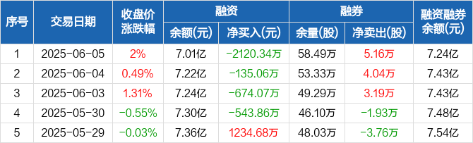 融资方面,当日融资买入2596.19万元,融资偿还4716.52万元,融资净偿还2120.34万元,连续4日净偿还累计3473.32万元。融券方面,融券卖出6.76万股,融券偿还1.6万股,融券余量58.49万股,融券余额2325.56万元。融资融券余额合计7.24亿元。