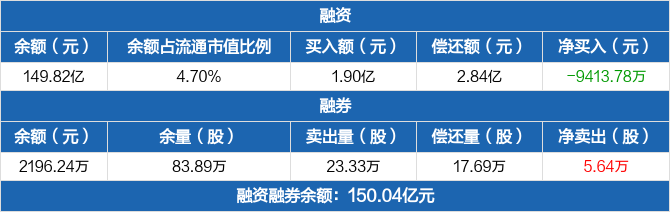 融资方面,当日融资买入1.9亿元,融资偿还2.84亿元,融资净偿还9413.78万元,净偿还额两市排名第五。融券方面,融券卖出23.33万股,融券偿还17.69万股,融券余量83.89万股,融券余额2196.24万元。融资融券余额合计150.04亿元。