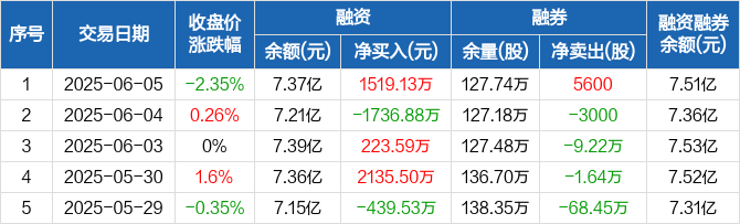 融资方面,当日融资买入6908.61万元,融资偿还5389.48万元,融资净买入1519.13万元。融券方面,融券卖出1万股,融券偿还4400股,融券余量127.74万股,融券余额1433.24万元。融资融券余额合计7.51亿元。