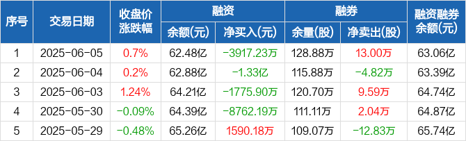 招商银行融资融券信息显示,2025年6月5日融资净偿还3917.23万元;融资余额62.48亿元,较前一日下降0.62%。