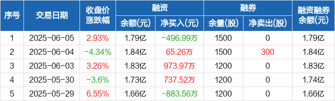 融资方面,当日融资买入1085.03万元,融资偿还1582.02万元,融资净偿还496.99万元。融券方面,融券卖出0股,融券偿还0股,融券余量1500股,融券余额8.37万元。融资融券余额合计1.79亿元。