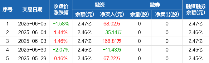 融资方面,当日融资买入477.49万元,融资偿还409.46万元,融资净买入68.02万元。融券方面,融券卖出0股,融券偿还0股,融券余量0股,融券余额0元。融资融券余额合计2.47亿元。