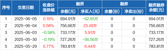 融资方面,当日融资买入107.74万元,融资偿还170.39万元,融资净偿还62.65万元。融券方面,融券卖出0份,融券偿还0份,融券余量0份,融券余额0元。融资融券余额合计694.01万元。