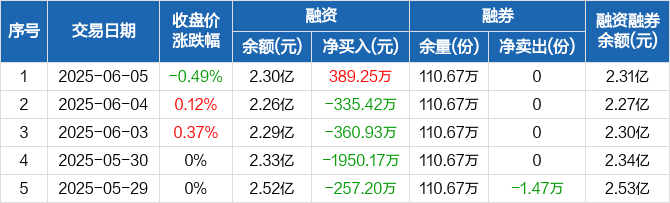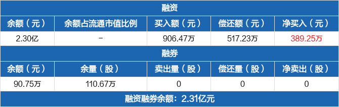 融资方面,当日融资买入906.47万元,融资偿还517.23万元,融资净买入389.25万元。融券方面,融券卖出0份,融券偿还0份,融券余量110.67万份,融券余额90.75万元。融资融券余额合计2.31亿元。