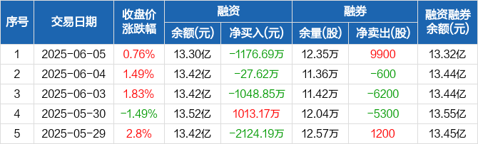 融资方面,当日融资买入4556.96万元,融资偿还5733.65万元,融资净偿还1176.69万元,连续3日净偿还累计2253.17万元。融券方面,融券卖出1.2万股,融券偿还2100股,融券余量12.35万股,融券余额246.04万元。融资融券余额合计13.32亿元。