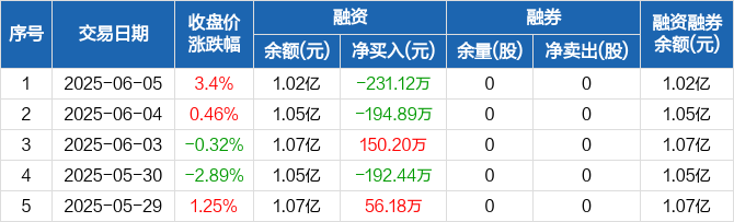 融资方面,当日融资买入712.3万元,融资偿还943.42万元,融资净偿还231.12万元。融券方面,融券卖出0股,融券偿还0股,融券余量0股,融券余额0元。融资融券余额合计1.02亿元。