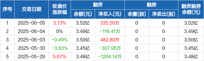 融资方面,当日融资买入2619.58万元,融资偿还2284.08万元,融资净买入335.5万元。融券方面,融券卖出0股,融券偿还0股,融券余量0股,融券余额0元。融资融券余额合计3.52亿元。