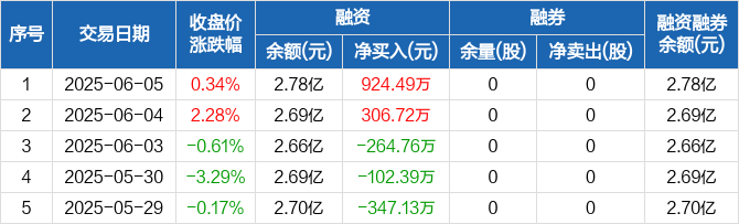 融资方面,当日融资买入2502.28万元,融资偿还1577.79万元,融资净买入924.49万元。融券方面,融券卖出0股,融券偿还0股,融券余量0股,融券余额0元。融资融券余额合计2.78亿元。