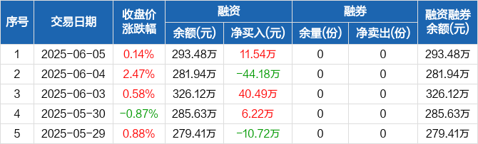 融资方面,当日融资买入39.27万元,融资偿还27.73万元,融资净买入11.54万元。融券方面,融券卖出0份,融券偿还0份,融券余量0份,融券余额0元。融资融券余额合计293.48万元。