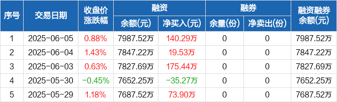 融资方面,当日融资买入325.19万元,融资偿还184.9万元,融资净买入140.29万元,连续3日净买入累计335.27万元。融券方面,融券卖出0份,融券偿还0份,融券余量0份,融券余额0元。融资融券余额合计7987.52万元。