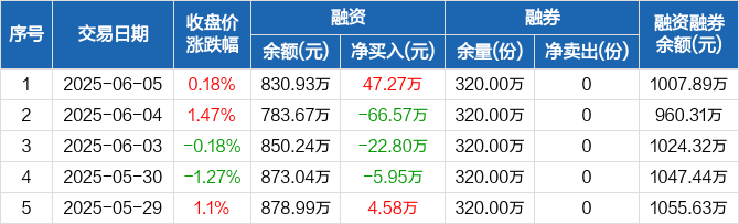 融资方面,当日融资买入114.33万元,融资偿还67.06万元,融资净买入47.27万元。融券方面,融券卖出0份,融券偿还0份,融券余量320万份,融券余额176.96万元。融资融券余额合计1007.89万元。