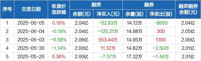 融资方面,当日融资买入663.13万元,融资偿还725.96万元,融资净偿还62.83万元。融券方面,融券卖出0股,融券偿还8600股,融券余量14.12万股,融券余额73.14万元。融资融券余额合计2.04亿元。