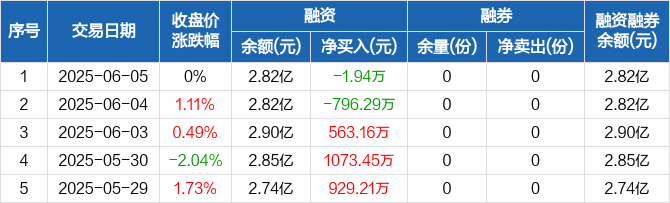 融资方面,当日融资买入3872万元,融资偿还3873.94万元,融资净偿还1.94万元。融券方面,融券卖出0份,融券偿还0份,融券余量0份,融券余额0元。融资融券余额合计2.82亿元。