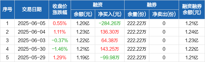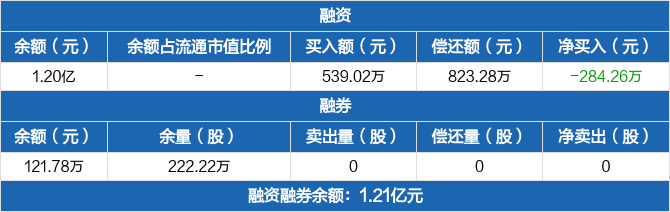 融资方面,当日融资买入539.02万元,融资偿还823.28万元,融资净偿还284.26万元。融券方面,融券卖出0份,融券偿还0份,融券余量222.22万份,融券余额121.78万元。融资融券余额合计1.21亿元。