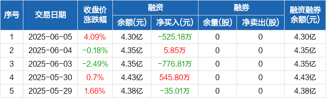 融资方面,当日融资买入3055.32万元,融资偿还3580.5万元,融资净偿还525.18万元。融券方面,融券卖出0股,融券偿还0股,融券余量0股,融券余额0元。融资融券余额合计4.3亿元。