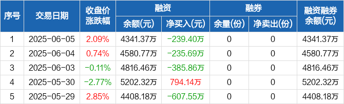 融资方面,当日融资买入1246.8万元,融资偿还1486.2万元,融资净偿还239.4万元,连续3日净偿还累计860.95万元。融券方面,融券卖出0份,融券偿还0份,融券余量0份,融券余额0元。融资融券余额合计4341.37万元。