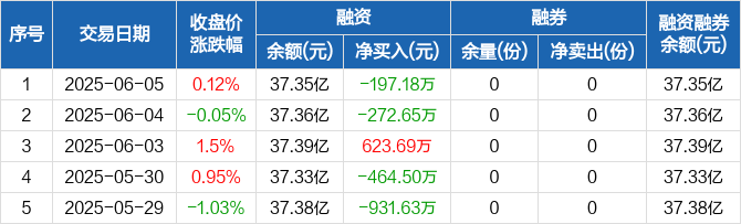融资方面,当日融资买入1095.29万元,融资偿还1292.47万元,融资净偿还197.18万元。融券方面,融券卖出0份,融券偿还0份,融券余量0份,融券余额0元。融资融券余额合计37.35亿元。