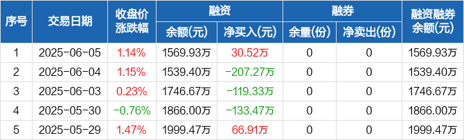 融资方面,当日融资买入184.64万元,融资偿还154.11万元,融资净买入30.52万元。融券方面,融券卖出0份,融券偿还0份,融券余量0份,融券余额0元。融资融券余额合计1569.93万元。