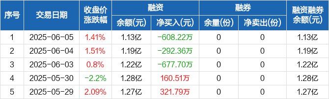 融资方面,当日融资买入5360.06万元,融资偿还5968.29万元,融资净偿还608.22万元,连续3日净偿还累计1578.29万元。融券方面,融券卖出0份,融券偿还0份,融券余量0份,融券余额0元。融资融券余额合计1.13亿元。