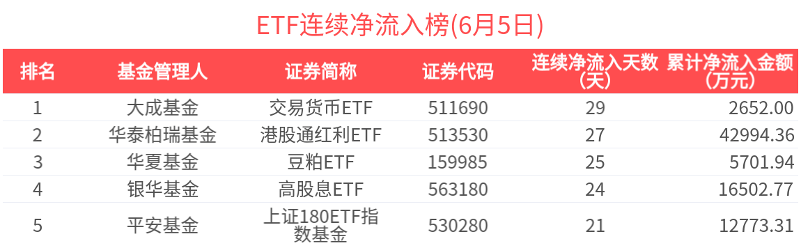 近期连续净流入的ETF基金有87只,居前的为交易货币ETF(29天)、港股通红利ETF(27天)、豆粕ETF(25天)、高股息ETF(24天)、上证180ETF指数基金(21天),分别净流入2652.00万元、4.30亿元、5701.94万元、1.65亿元、1.28亿元。其中,豆粕ETF近25天加速流入,近25天累计流入5701.94万元,基金规模快速增长至26.87亿元。
