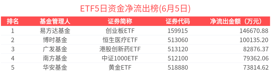 近5天累计净流出超过1亿元的有79只,金额居前的为创业板ETF、恒生医疗ETF、港股创新药ETF、中证1000ETF、黄金ETF等,分别净流出14.67亿元、10.01亿元、8.29亿元、7.94亿元、7.38亿元。其中,创业板ETF近5天资金大幅净流出,基金规模快速下降至831.51亿元。