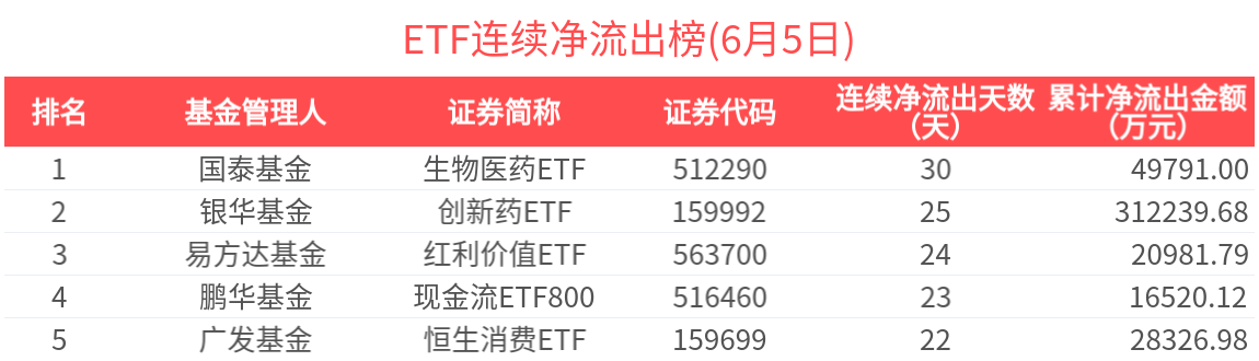 连续净流出的ETF基金有253只,居前的为生物医药ETF(30天)、创新药ETF(25天)、红利价值ETF(24天)、现金流ETF800(23天)、恒生消费ETF(22天),分别净流出4.98亿元、31.22亿元、2.10亿元、1.65亿元、2.83亿元。其中,生物医药ETF近30天加速流出,近30天累计流出4.98亿元,基金规模快速下降至36.77亿元。