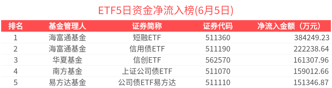 拉长时间看,近5天累计净流入超过1亿元的有62只,金额居前的为短融ETF、信用债ETF、信创ETF、上证公司债ETF、公司债ETF易方达等,分别净流入38.42亿元、22.22亿元、16.13亿元、15.90亿元、15.13亿元。其中,短融ETF近5天资金大幅净流入,基金规模快速增长至466.54亿元。