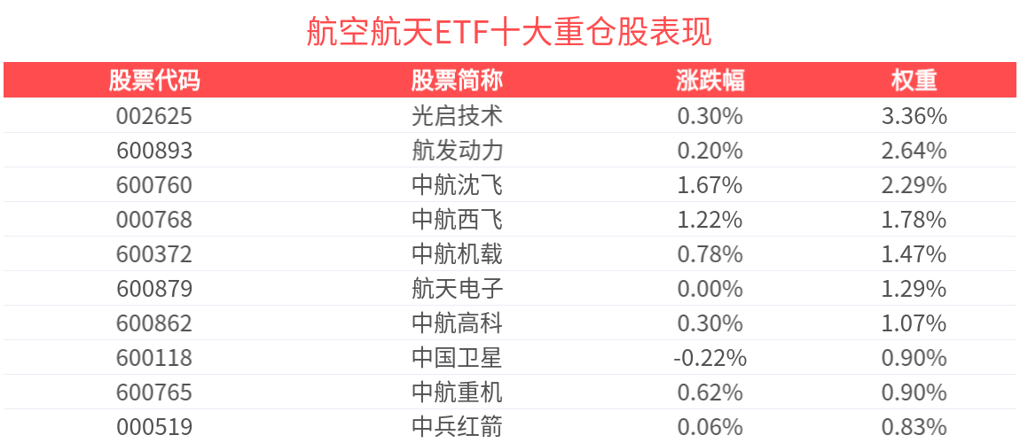 数据显示,截至2025年5月30日,国证航天航空行业指数(CN5082)前十大权重股分别为光启技术(002625)、航发动力(600893)、中航沈飞(600760)、中航西飞(000768)、中航机载(600372)、航天电子(600879)、中航高科(600862)、中国卫星(600118)、中航重机(600765)、中兵红箭(000519),前十大权重股合计占比52.51%。