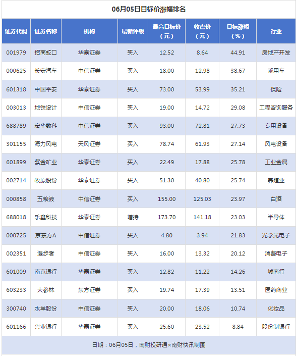 6月5日,券商给予上市公司目标价共16次,按当日收盘价计算,目标价涨幅排名居前的公司有招商蛇口、长安汽车、中国平安,目标价涨幅分别为44.91%、38.67%、35.21%,分别属于房地产开发、乘用车、保险行业。
