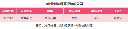 评级调高方面,6月5日,中信证券对水羊股份的评级从“增持”调高至“买入”。
