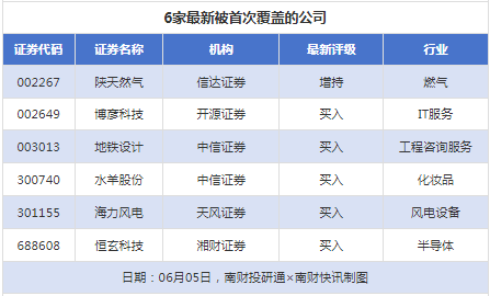 首次覆盖方面,6月5日券商共给出了6次首次覆盖,其中陕天然气获得信达证券给予“增持”评级,博彦科技获得开源证券给予“买入”评级,地铁设计、水羊股份均获得中信证券给予“买入”评级,海力风电获得天风证券给予“买入”评级。
