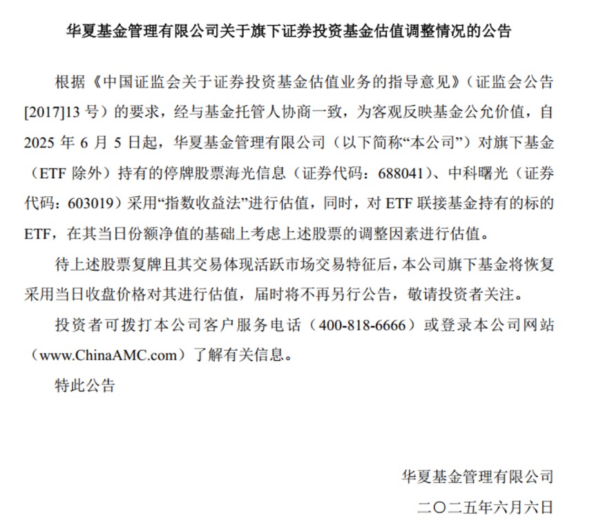 今日,多家基金公司发布公告称,旗下基金(ETF除外)对所持有的停牌股海光信息、中科曙光采用“指数收益法”进行估值。同时,对ETF联接基金持有的标的ETF,在其当日份额净值的基础上考虑上述股票的调整因素进行估值。