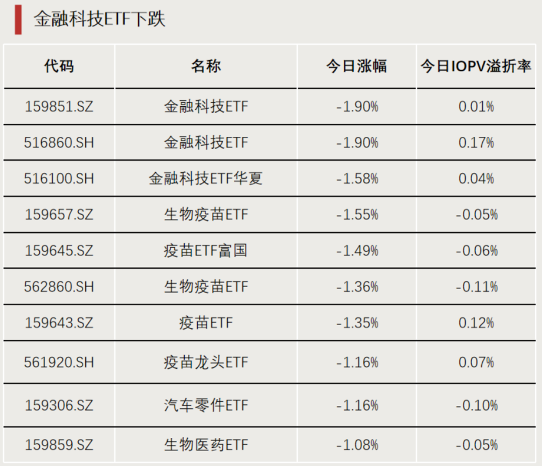 金融科技、生物疫苗相关ETF跌幅居前,金融科技ETF(159851)领跌全市场ETF。