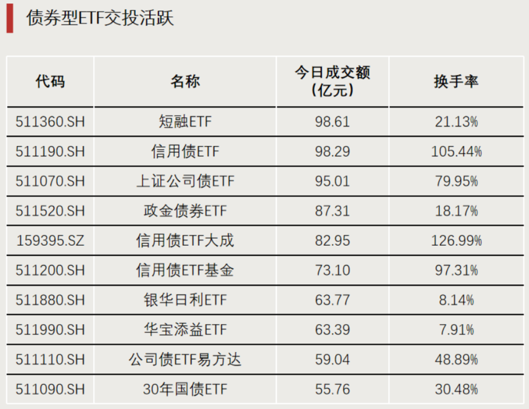 债券型ETF交投活跃,全市场成交额前十的ETF中,债券型ETF占据八席。
