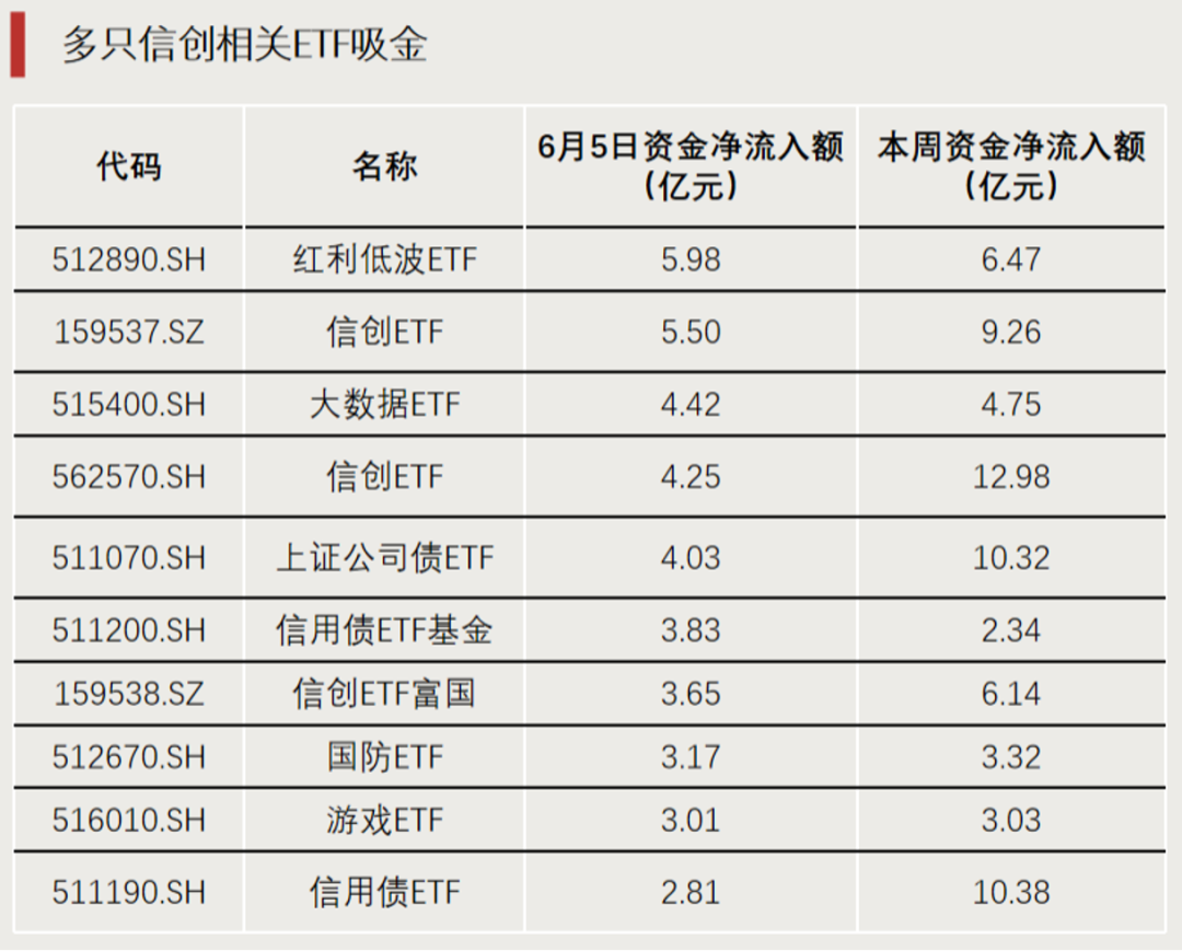 红利低波ETF(512890)以5.98亿元的资金净流入额位列榜首,信创ETF(159537)以5.50亿元的资金净流入额紧随其后。大数据ETF(515400)、信创ETF(562570)、上证公司债ETF(511070)资金净流入额均超4亿元。