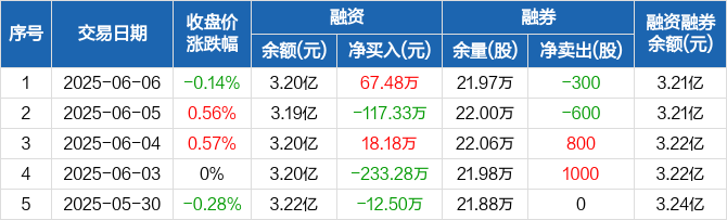 融资方面,当日融资买入464.38万元,融资偿还396.9万元,融资净买入67.48万元。融券方面,融券卖出0股,融券偿还300股,融券余量21.97万股,融券余额157.09万元。融资融券余额合计3.21亿元。