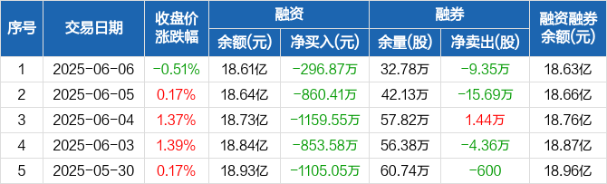 融资方面,当日融资买入2205万元,融资偿还2501.87万元,融资净偿还296.87万元,连续6日净偿还累计4589.3万元。融券方面,融券卖出700股,融券偿还9.42万股,融券余量32.78万股,融券余额193.05万元。融资融券余额合计18.63亿元。
