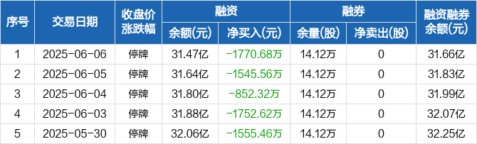 融资方面,当日融资买入0元,融资偿还1770.68万元,融资净偿还1770.68万元,连续12日净偿还累计1.86亿元。融券方面,融券卖出0股,融券偿还0股,融券余量14.12万股,融券余额1922.66万元。融资融券余额合计31.66亿元。