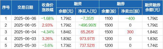 融资方面,当日融资买入583.97万元,融资偿还591.33万元,融资净偿还7.35万元。融券方面,融券卖出0股,融券偿还400股,融券余量1100股,融券余额6.04万元。融资融券余额合计1.79亿元。