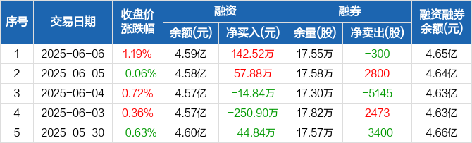 融资方面,当日融资买入987.13万元,融资偿还844.61万元,融资净买入142.52万元。融券方面,融券卖出3500股,融券偿还3800股,融券余量17.55万股,融券余额595.77万元。融资融券余额合计4.65亿元。