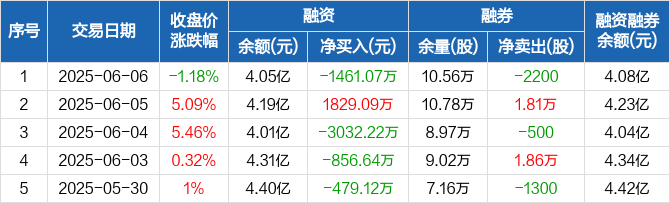 景旺电子融资融券信息显示,2025年6月6日融资净偿还1461.07万元;融资余额4.05亿元,较前一日下降3.48%。