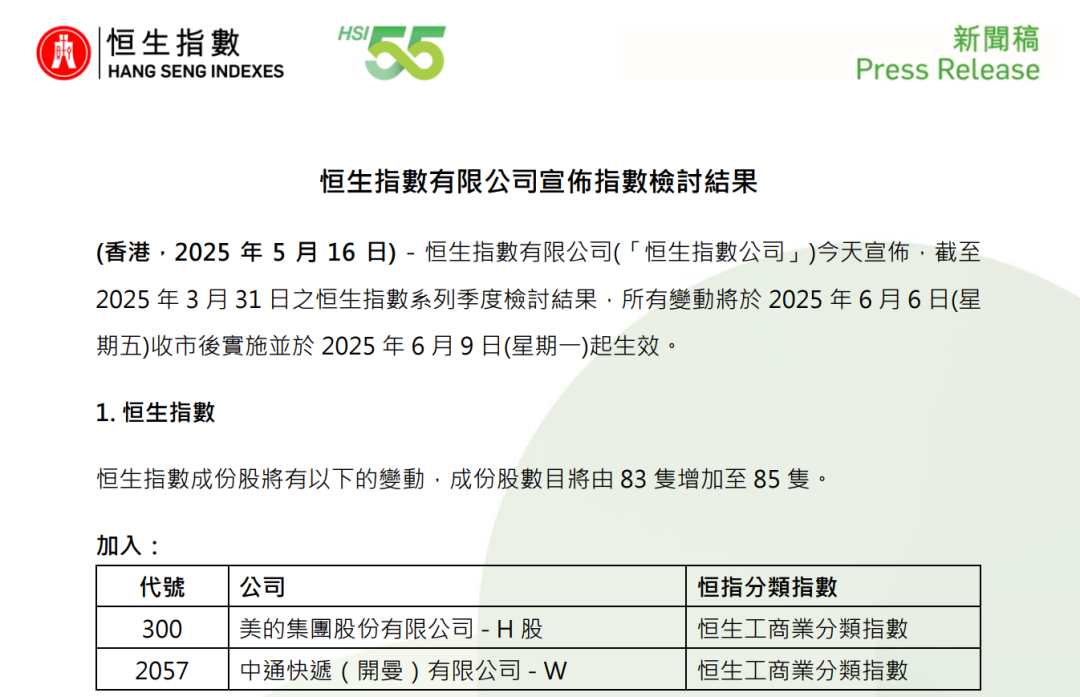 根据恒生指数公司5月16日的公告,恒生指数系列检讨结果所有调整将于2025年6月6日(星期五)收市后实施,并于今日(2025年6月9日)起生效。恒生指数成份股数目将由83只增加至85只,调入美的集团、中通快递;恒生科技指数调入比亚迪股份,剔除阅文集团。