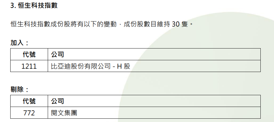 恒生科技指数调入比亚迪股份,剔除阅文集团,成份股数量仍为30只。