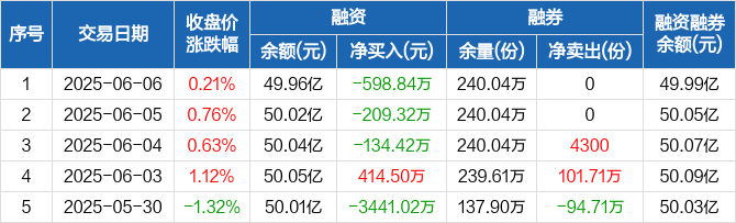 融资方面,当日融资买入3647.95万元,融资偿还4246.79万元,融资净偿还598.84万元,连续3日净偿还累计942.58万元。融券方面,融券卖出0份,融券偿还0份,融券余量240.04万份,融券余额350.94万元。融资融券余额合计49.99亿元。