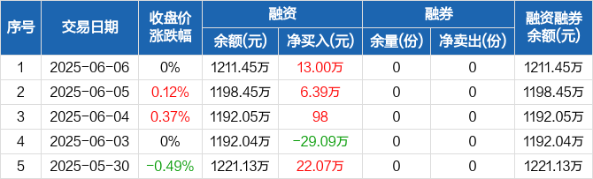 融资方面,当日融资买入30.78万元,融资偿还17.78万元,融资净买入13万元,连续3日净买入累计19.4万元。融券方面,融券卖出0份,融券偿还0份,融券余量0份,融券余额0元。融资融券余额合计1211.45万元。