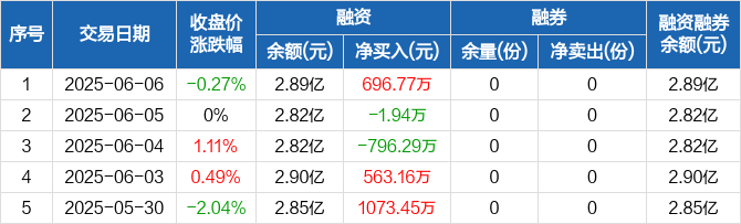 融资方面,当日融资买入3139.54万元,融资偿还2442.77万元,融资净买入696.77万元。融券方面,融券卖出0份,融券偿还0份,融券余量0份,融券余额0元。融资融券余额合计2.89亿元。