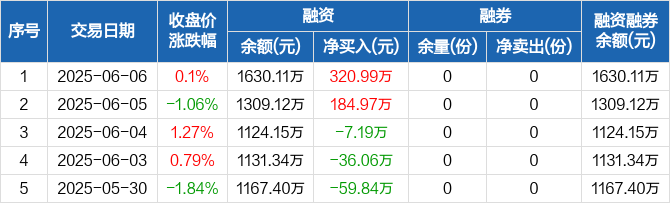 融资方面,当日融资买入1053.49万元,融资偿还732.5万元,融资净买入320.99万元。融券方面,融券卖出0份,融券偿还0份,融券余量0份,融券余额0元。融资融券余额合计1630.11万元。