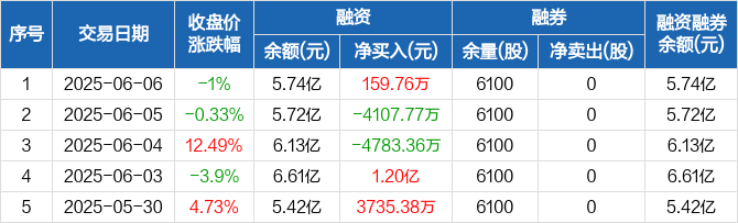 融资方面,当日融资买入2.41亿元,融资偿还2.39亿元,融资净买入159.76万元。融券方面,融券卖出0股,融券偿还0股,融券余量6100股,融券余额12.69万元。融资融券余额合计5.74亿元。